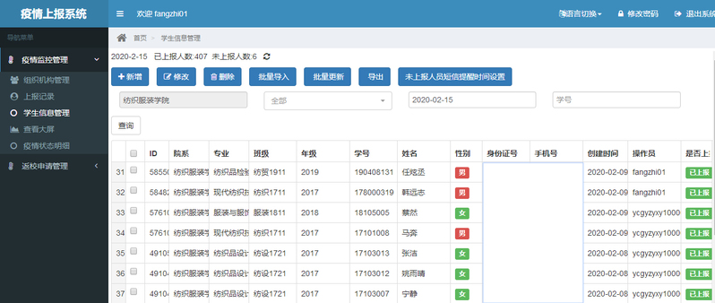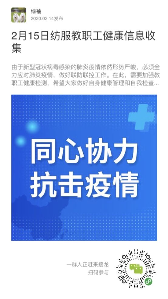 依托大数据,信息快捷。运用微信接龙小程序和学生疫情上报系统,实现信息收集的公开化、智能化。教职工每日9:30前在“纺服通知微信群”完成“纺服教职工健康信息收集”接龙,主要汇报教师目前所在地、本人及家庭成员身体状况等。学生每日9:00前在“完美校园”学生疫情上报系统“健康打卡”,系统自动汇总上报数据,每日10:00由赵菊梅和陈玲敏老师分别汇总收集的师生数据并上报“纺服疫情工作组”,信息确认无误后再上报学校。