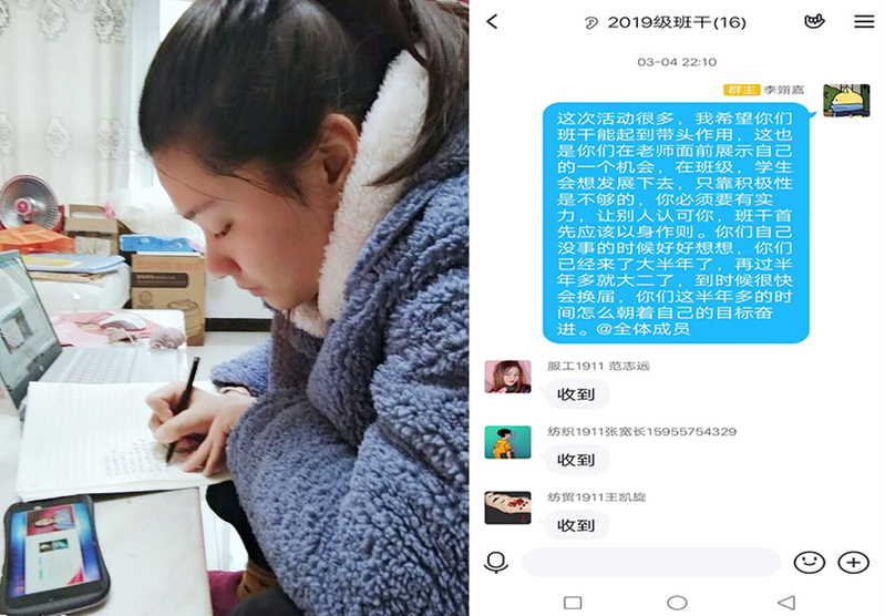 君子藏器于身,待时而动,何不利之有?1月底,教育部要求各高校结合实际,利用各种网络平台开展网络教学,以确保“停课不停教、停课不停学”。纺织服装学院根据学校《新型冠状病毒感染的肺炎疫情防控工作方案》及教务处《关于开展2020年春学期在线教学的通知》制定了线上教学方案,学院学生在任课教师的精心组织下,认真进行线上学习交流。学生干部勤做教师的好帮手,协助教师组织线上教学纪律、保证班级签到率、积极发言交流,调动学习氛围;课后帮助有疑问的同学,做好答疑释惑。在学有余力的情况下,很多学生干部利用这段时间新学了书法、乐器、绘画、剪纸、手工编织、烹饪等技能。