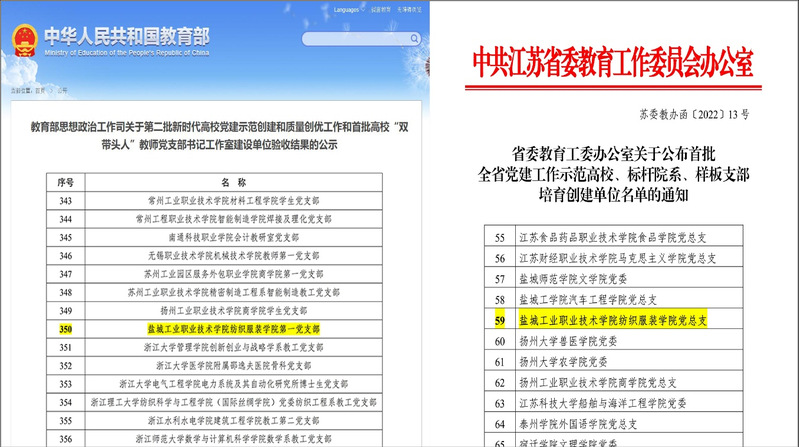 近日,江苏省委教育工委公布了首批培育建设的全省党建工作示范高校、党建工作标杆院系和党建工作样板支部名单,纺织服装学院党总支成功入选首批全省党建工作标杆院系培育创建单位。