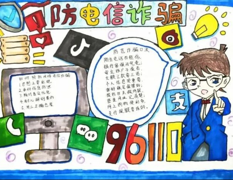 丹青写意,妙笔生花。9月22日-9月29日,学院组织防范电信诈骗手抄报艺术创作活动。活动以“手脑结合・创意反诈”为亮点,学生通过手绘漫画、防诈口诀、案例图解、数据图表等多元形式,将常见诈骗套路转化为可视化警示内容,在版面设计中融入法律条文、防范口诀及自身体会,兼具知识性与艺术性。活动充分激发学生的自主创作热情,不仅加深了创作者对诈骗手段的深层理解,更以直观生动的载体实现防诈知识在校园内的立体化渗透,营造“人人参与创作、处处可见警示”的反诈文化氛围,让防诈意识通过笔尖印记深植学生心中。