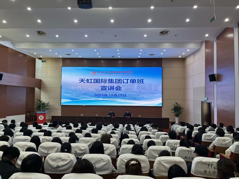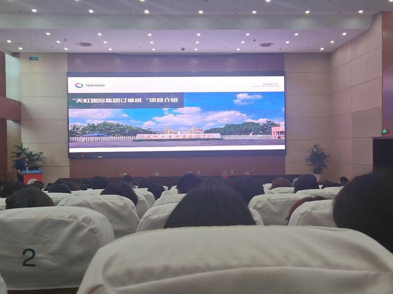 随后,在学术报告厅举行了天虹国际集团“订单班”宣讲会,纺织服装学院和智能制造学院共400余名学生参会。会上,纺织服装学院党总支副书记毛雷介绍了“订单班”开设对同学们在专业学习、企业实践、保障就业等方面的意义和优势;宋小春介绍了天虹国际集团的组织架构、市场布局及国际化发展路径,详细分析了订单班的设置形式及培养模式,并细致解答了同学们现场咨询的相关问题。